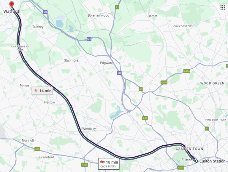 La forma más rápida es tomar un tren directo desde London Euston hasta Watford Junction. La línea que debes coger es West Midlands Railway, línea verde o morada y bajar en Watford Juction, el trayecto suele durar muy poco, alrededor de unos 20 minutos.